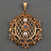 14kt gouden hanger met fleur-de-lis en bloemen gezet met blauw saffiertje, centraal gezet met twee pareltjes, brutogewicht 7,6 gram, 4,5 × 3,2 cm