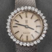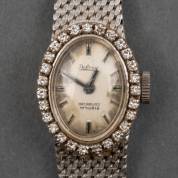 14kt witgouden damescocktailpolshorloge Defray, de bezel gezet met achtkantgeslepen diamanten, brutogewicht 26,6 gram, lengte circa 17 cm