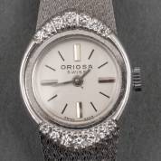 14kt witgouden damespolshorloge Oriosa, mechanisch uurwerk, de bezel gezet met 14 achtkantgeslepen diamantjes, aan 14kt gouden Milanese band, brutogewicht 28,6 gram, lengte circa 17 cm