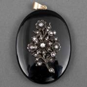 14kt gouden en onyx rouwmedaillonhanger, de voorzijde met 1e gehalte zilveren bloemenapplique gezet met roosdiamanten, de achterzijde met 14kt gouden medaillon, aan plaatoog hanger, brutogewicht 48,6 gram, 7 × 4,5 cm