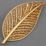14kt gouden bladvormige filigrain broche, speld onedel, gewicht 13,6 gram, lengte 6,5 cm
