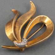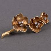 14kt gouden broche in de vorm van een bloemtakje, de harten gezet met achtkantgeslepen diamantjes, circa 0.21ct., brutogewicht 11,2 gram, 6 × 2 × 1,8 cm