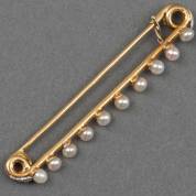 18kt gouden speldbroche gezet met zaadpareltjes en twee roosgeslepen diamantjes, brutogewicht 3,5 gram, lengte 5 cm