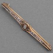 14kt gouden brochette gezet met oudslijpsel diamanten, brutogewicht 6,5 gram, lengte 7 cm