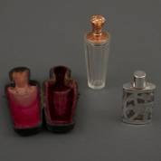 Kristallen parfumflacon met 14kt gouden montuur en dop, in lederen foedraal, daarbij: parfumflacon met ajourgezaagd 1e gehalte zilveren montuur -defecten-