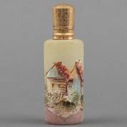 Glazen parfumflacon met 14kt gouden dop en koud emaille voorstelling: dorpsgezicht, 19e eeuw, brutogewicht 65 gram, hoogte 8,5 cm