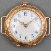 14kt gouden damesremontoir, mechanisch uurwerk, witgeëmailleerde wijzerplaat, brutogewicht 19,8 gram, Ø 3 cm