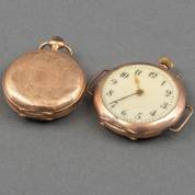 Twee damesremontoirs, één 14kt goud en één BWGG, beide met mechanische uurwerken, wit- en crèmekleurige wijzerplaat, brutogewicht 32,24 gram, Ø 2,5 en 3,0 cm