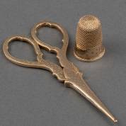 14kt gouden vingerhoed met gegraveerde sterren en ongegraveerd cartouche, schaartje met 14kt gouden greepjes en schede met gegraveerd stippeldecor, gewicht schede en vingerhoed, brutogewicht 12 gram, schaartje 9 × 4 cm
