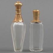 Twee kristallen parfumflacons met 14kt gouden dop, 19e en 20e eeuw -deukjes-, brutogewicht 100 gram, hoogte 11,5 cm