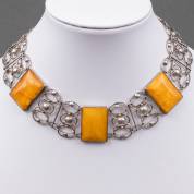 2e gehalte zilveren choker met drie rechthoekige cabochongeslepen barnstenen, brutogewicht 41, 0 gram, lengte 33,5 cm en rocailles, met bewijs van aankoop uit 2005 van Antiker Smuck, Lauterbach voor 1600