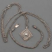 1e gehalte zilveren jasseronschakelcollier waaraan ruitvormige Zeeuwseknoop hanger, en 1e gehalte zilveren schakelarmband, lengte collier 100 cm, lengte armband 21 cm