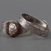 1e gehalte zilveren gesparmband met rocaillegravering, meester: Bracelon Ltd, Birmingham, 1977, en 2e gehalte zilveren stijve armband gezet met camee van roos en fijne bloemgravering, brutogewicht 69,2 gram