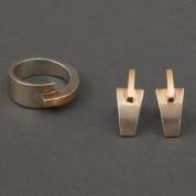 Paar 1e gehalte zilveren oorstekers en ring, met 14kt gouden inleg, Nol, mt. 17,75, gewicht 20,4 gram