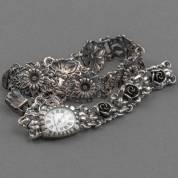 1e gehalte zilveren armband met bloemvormige schakels en 2e gehalte zilveren damespolshorloge, Bijoux Jaques, mechanisch uurwerk, aan 2e gehalte zilveren schakelband gedecoreerd met rozen, ontwerp: Theodor Klotz voor Teka, Pforzheim, circa 1970, brutogewicht 61,4 gram , armband 19,5 cm, lengte horloge 18 cm