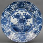 Japans porseleinen schotel met blauw-wit bloemenvaasdecor, Wanli-stijl, Arita, circa 1700, Ø 39 cm