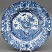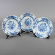 Drie Chinees porseleinen borden met blauw-wit kostbaarhedendecor, eerste helft 18e eeuw -één bord met twee randchipjes-, Ø 23 cm