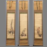 Drie Japanse rolschilderingen van dezelfde kunstenaar: vrouw trekt haar schoen aan, twee runderen in landschap, en een rokende vrouw, alle gesigneerd, 20e eeuw, in tomobako -vier jikusaki afgebroken-, 178 × 40 cm