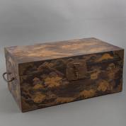 Japans lakwerk reiskist, de buitenzijde met pagode- en landschapsdecor, het interieur met twee vakken in het deksel, een uitneembare laag met drie bedekte vakken achter klepjes, daaronder drie vakken waarvan twee met klep, 20e eeuw -gebruikssporen, enkele beschadigingen, enkele missende spijkertjes van scharnieren-, 23 × 55 × 33 cm
