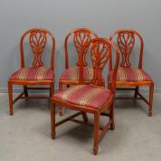 Vier mahonie stoelen met opengewerkte rugleuning en gestreepte ribfluwelen bekleding, laatste kwart 20e eeuw, 96 × 52 × 56 cm
