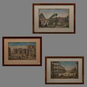 Opticaprent: Leipzig, en twee illuminatieprenten: figuren tussen Romeinse ruïnes, 18e eeuw, alle drie circa 25 × 40 cm