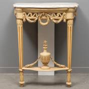 Witgelakt wandtafeltje met gecontourneerd marmeren blad op rijk gesneden onderstel met guirlandes, Louis Seize-stijl en mogelijk periode -verhoogd onder blad, aan achterzijde een dragende plaat gemaakt-, 81 × 68 × 52 cm