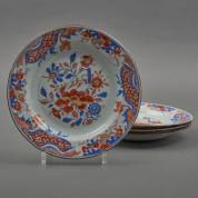 Vier Chinees porseleinen Imari borden met bloemdecor, 18e eeuw -haarlijnen, randchips, één met gelijmde scherf-, Ø 22,7 cm