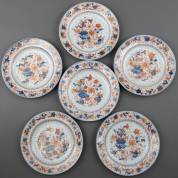 Zes Chinees porseleinen Imari borden met bloemenvaasdecor, 18e eeuw -één met gelijmde scherven-, Ø 25,5 cm