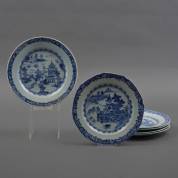 Vijf Chinees porseleinen octagonale borden, en één bord met ronde rand, alle met blauw-wit waterlandschapsdecor, Qianlong -defecten-, Ø 23 cm
