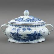Gecontourneerde Chinees porseleinen terrine met blauw-wit wilgendecor, Qianlong -deksel gerestaureerd-, 22,5 × 37 × 23 cm