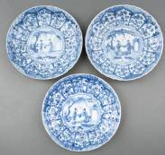 Drie Chinees porseleinen gelobde diepe borden met gecontourneerde en geribbelde rand, waarop blauw-wit bloemdecor in cartouches, het plat met twee figuren bij bruggetje, Kangxi -alle met randschilfers, één bord met reparatie-, Ø 22 cm
