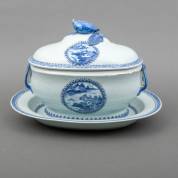 Chinees porseleinen terrine op onderschotel, voorzien van blauw-witte ronde cartouches met rivierlandschapsdecor, Qianlong/Jiaqing -enkele kleine defecten-, 25 × 38 × 31,5 cm