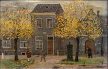 Toegeschreven aan Harm Kamerlingh Onnes (1893-1985), spelende kinderen op straat, marouflé, niet gesigneerd, verso gedateerd 'Delft ±1954' -doek is aan rechterzijde korter dan het paneel-, 24 × 36,3 cm