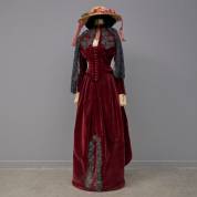 Verstelbare antieke mannequin met bordeauxkleurige velours rok en lijfje, gedecoreerd met bloempatroon van zwarte kraaltjes, daarbij kanten rouwsjaal, zwart vilten hoed en strohoed, begin 20e eeuw -gebruikssporen, slijtage, enkele gaatjes-, hoogte mannequin 160 cm