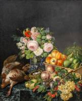 Hollandse School: stilleven met bloemen, fruit en fazanten, olieverf op doek, r.o. gemonogrammeerd B in druivenrank, 19e eeuw -gedoubleerd, enkele inschilderingen, van nieuw spieraam voorzien-, 80 × 65 cm
