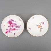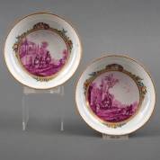 Paar porseleinen schoteltjes met centraal purper decor van valkeniers en ruiters in landschap, omcirkeld door vergulde bies met polychroom bloemdecor, gemerkt, uitvoering Meissen, Duitsland, Marcolini-periode, 1774-1813, Ø 13,5 cm, herkomst: privécollectie van kunsthandelaar Abraham van der Meer (1927-2008), destijds gevestigd op de Spiegelgracht 3 te Amsterdam