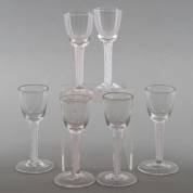 Zes slingerglaasjes met conische kelk, de stam voorzien van witte spiralen rond witte netwerkspiraal, Engeland, tweede helft 18e eeuw -één met chipje in kelk, een ander met minieme schilfer in de voet-, 11,5 cm