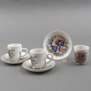 Drie Chinees porseleinen Chine de commande kop-en-schotels met polychroom decor van het wapen de Friese familie Van Burmania, circa 1740-1760 -randschilfers, twee kopjes met een haarlijn-, 7 × 11,7 cm