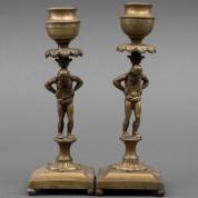 Paar messing kandelaartjes, de bobèches staand op dakje van bladeren, die gedragen worden door Atlanten in lendendoek, 18 × 6 × 6 cm