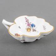 Porseleinen bladvormig schaaltje met polychroom beschilderd bloemdecor, gemerkt, uitvoering Meissen, Duitsland, 18e eeuw, 4 × 9 × 12,3 cm, herkomst: privécollectie van kunsthandelaar Abraham van der Meer (1927-2008), destijds gevestigd op de Spiegelgracht 3 te Amsterdam