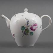 Porseleinen theepot met beschilderd bloemdecor, gemerkt 'R', vermoedelijk uitvoering Volkstedt Rudolstadt, 18e eeuw -barst aan onderzijde, schilfer van tuit-, 15 × 20 cm, herkomst: privécollectie van kunsthandelaar Abraham van der Meer (1927-2008), destijds gevestigd op de Spiegelgracht 3 te Amsterdam