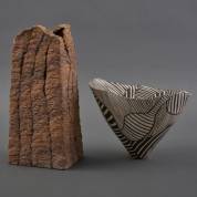 Maria Weers (20e eeuw), keramische vaas met organische vormen, en dunwandige vaas met strependecor, beide met monogram 'MW', Nederland, jaren '80, 33 × 15 × 12 cm