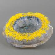 Dikwandig glazen kunstobject, bedekt met blauwe en gele pigmenten, 9 × 26 × 24 cm
