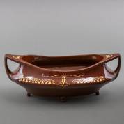 Bruin aardewerk jardinière met ingelegd decor van een kever, vermoedelijk ontwerp Chris van der Hoef voor Potterij Rembrandt of Amstelhoek, niet gemerkt -één pootje gelijmd-, 11,5 × 30 × 14 cm