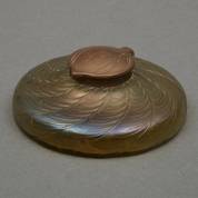 Iriserend glazen inktpot met messing walnootvormige deksel, mogelijk uitvoering Loetz, circa 1900, 5,5 × Ø 13,5 cm