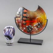 Glazen vaas met paarse en witte kern, uitvoering Målerås, Zweden, 17 × Ø 10,5 cm, en rond rood-geel glasobject op standaard, 37 × Ø 30 × 10 inclusief standaard