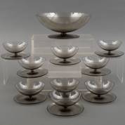 Rookglazen ijs-/fruitschaal met negen bijbehorende coupes, ontwerp Andries Dirk Copier, uitvoering Glasfabriek Leerdam, schaal Ø 22,5 cm