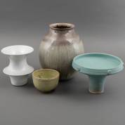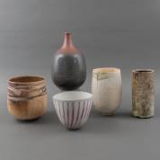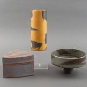 Vijf keramische objecten waaronder rakugestookte vazen, enkele gesigneerd, Nederland, jaren '70-'90 -gebruikssporen-, 26 × Ø 18 cm