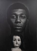 Tjeerd Frederikse (1946), portret van een man met pop, zwart-witfotoafdruk op papier, verlijmd op spaanplaat, niet gesigneerd, 123 × 87 cm