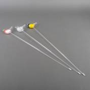 Drie glazen vogeltjes met gekleurde kern, op lange glazen steel, 70 cm